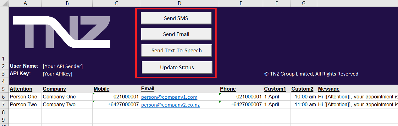 Start by adding your TNZ User access credentials (your Sender/APIKey above).